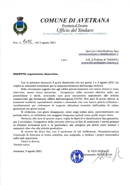 Per questo motivo stamattina ho interessato “e-distribuzione” e S.E. il Prefetto di Taranto denunciando il mio (nostro!) disappunto su quanto accaduto negli ultimi due giorni!».