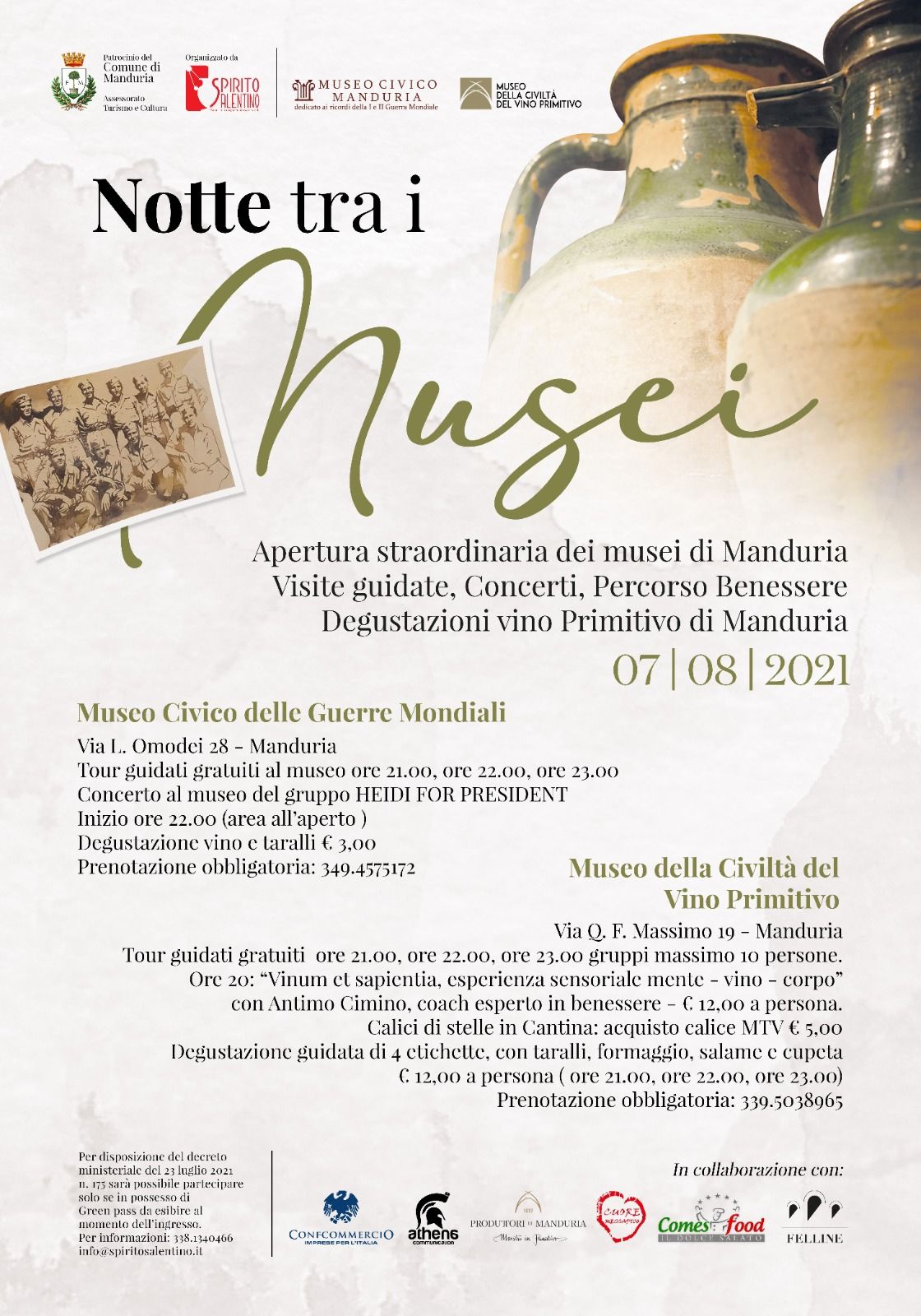 Sotto i riflettori saranno il Museo Civico delle Guerre Mondiali e il Museo della Civiltà del Vino Primitivo, i quali eccezionalmente ospiteranno visite guidate gratuite da sera sino a notte, con l’aggiunta di eventi ed esperienze di altro genere. In entrambe le location le rispettive visite partiranno alle ore 21, alle 22 e alle 23, nel rispetto delle norme anti-assembramento.