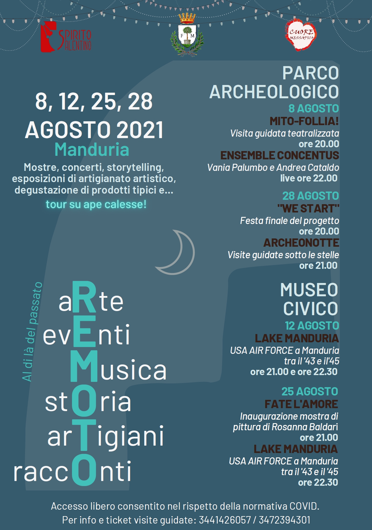 Arte, eventi, musica, storia, artigianato e racconti sono gli ingredienti di REMOTO. Al di là del passato, la rassegna agostana, ideata dall’associazione Vento Refolo e dal gruppo Cuore Messapico, è organizzata dalla cooperativa Spirito Salentino per la valorizzazione di due luoghi simbolici della cultura a Manduria: il Parco Archeologico delle Mura Messapiche e il Museo Civico delle Guerre Mondiali.