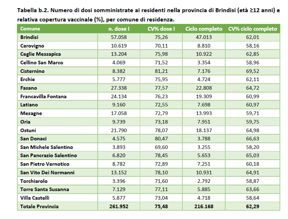 Il comune con la più alta percentuale di vaccinati è Cisternino (69,52%). San Pancrazio è al 65,03%, Erchie al 62,11%, Francavilla al 60,93% e Oria al 59,75%