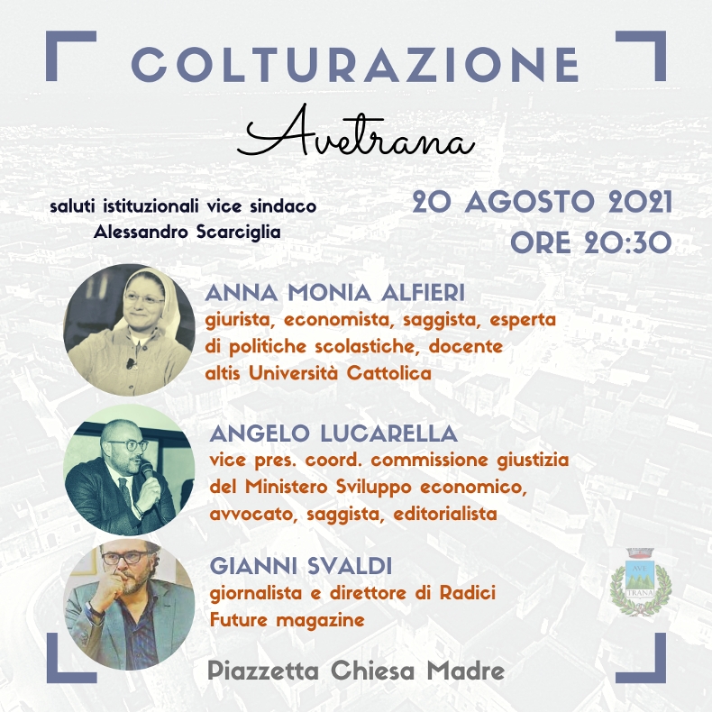 Il 20 agosto, alle ore 20:30 in piazzetta della chiesa Madre, saranno ospiti suor Anna Monia Alfieri e Angelo Lucarella (entrambi tra l’altro di origine pugliese): al centro del dibattito le questioni attuali più importanti sul fronte sociale, educativo, giuridico ed economico. La religiosa Alfieri è giurista, economista ed esperta di politiche scolastiche, membro della Consulta Pastorale scolastica e del Consiglio Nazionale Scuola della CEI, saggista e docente ALTIS Università Cattolica. Le è stato assegnato l’Ambrogino d’Oro 2020, Medaglia di Benemerenza Civica, per il suo impegno civile a favore della libertà di scelta educativa e del pluralismo scolastico. Scrive ed interviene anche su Il Giornale, L’Occidentale, Formiche, Start Magazine, ecc. ed è spesso invitata a Quarta Repubblica, su rete 4, per la trasmissione di Nicola Porro. Lucarella, invece, è vice pres. coord. della commissione giustizia del Ministero dello Sviluppo Economico, columnist, in pagina politica ed economica, per La Voce di New York (ma scrive anche su Italia Oggi e Sole 24 Ore, analisi giuridiche, ed interviene spesso su Formiche e l’Occidentale) nonché direttore del dipartimento studi politici e costituzionali della Federiciana Università popolare. È anche saggista con la storica Aracne editrice.