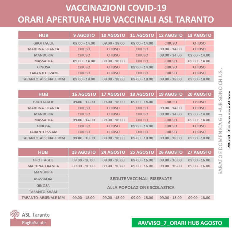 Fino al 20 agosto, gli hub rispetteranno le seguenti aperture: l’hub di Manduria sarà operativo il giovedì e il venerdì dalle 9 alle 14; l’hub di Grottaglie sarà aperto il lunedì e il mercoledì dalle 9 alle 14 e il martedì dalle 9 alle 18; a Martina Franca il centro vaccinale aprirà il giovedì dalle 9 alle 14; a Massafra l’hub sarà operativo il lunedì e il venerdì dalle ore 9 alle ore 14 e il martedì dalle ore 9 alle ore 18; a Ginosa il mercoledì dalle 9 alle 14; a Taranto, l’hub presso la SVAM è chiuso, mentre l’Arsenale sarà operativo dal lunedì al venerdì dalle 9 alle 18.