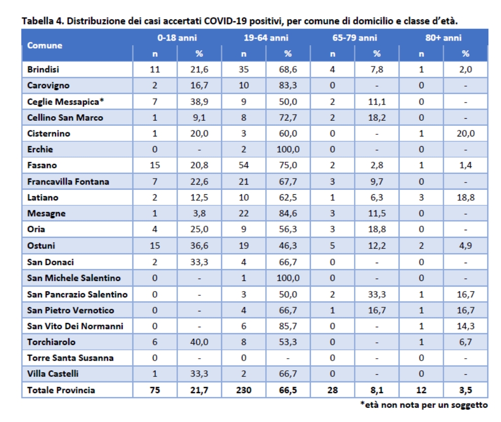 Per quanto riguarda la distribuzione per Comune i positivi sono 72 a Fasano, 51 a Brindisi, 41 a Ostuni, 31 a Francavilla Fontana, 26 a Mesagne, 19 a Ceglie Messapica, 16 a Latiano, 16 a Oria, 15 a Torchiarolo, 12 a Carovigno, 11 a Cellino San Marco, 7 a San Vito dei Normanni, 6 a San Donaci, 6 a San Pancrazio Salentino, 6 a San Pietro Vernotico, 5 a Cisternino, 3 a Villa Castelli, 2 a Erchie, 1 a San Michele Salentino, 0 a Torre Santa Susanna.