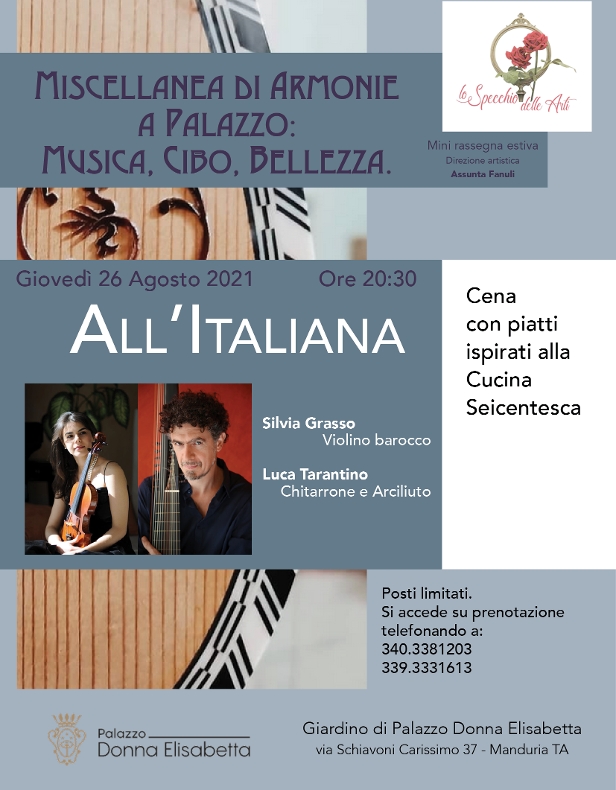 Nello splendido scenario del giardino di Palazzo Donna Elisabetta, nel cuore del centro storico di Manduria, via Schiavoni Carissimo, 37, giovedì 26 agosto, alle ore 20,30, “All’Italiana” e cena con piatti ispirati alla cucina seicentesca.