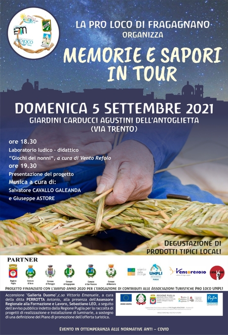 “Memorie e sapori in tour” è il progetto che nasce dalla sinergia e dalla collaborazione tra la Pro Loco di Maruggio, Fragagnano, Manduria, Sava e la Pro loco Marciana, approvato dalla Regione Puglia nell’ambito dell’Avviso anno 2020 per l’erogazione di contributi alle Associazioni Turistiche Pro Loco.