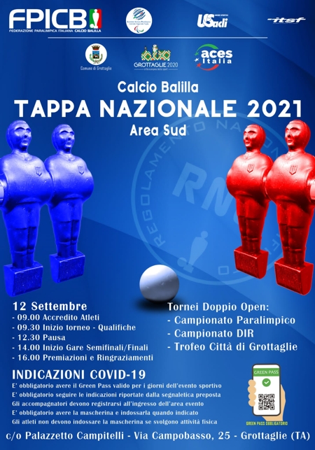 Lo sport continua a regalare intensi momenti formativi e agonistici a Grottaglie, sulla scia della nomina a Città Europea dello Sport 2020. Domenica 12 settembre, infatti, nel palazzetto dello sport “Alessandro Marinelli”, la città ospiterà la tappa nazionale di qualifica al Campionato Italiano di Calcio Balilla Paralimpico, organizzato dalla delegazione pugliese FPICB (Federazione Paralimpica Italiana Calcio Balilla), presieduta dal delegato regionale Vito Sasanelli. Si tratta di un evento patrocinato dal Comune di Grottaglie e dal CIP (Comitato Italiano Paralimpico) Puglia, in cui si svolgerà un torneo di calcio balilla paralimpico, finalizzato alla conoscenza e alla diffusione dei valori insiti nell’attività sportiva per tutti, in un momento florido per l’agonismo e lo sport italiani.