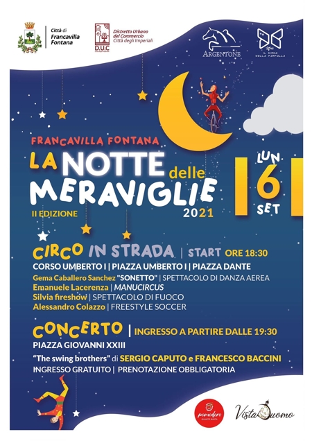 Lunedì 6 settembre Francavilla Fontana si prepara a vivere la seconda edizione della Notte delle Meraviglie. Una serata speciale con le note di Sergio Caputo e Francesco Baccini, la magia degli artisti di strada, il fascino dell’arte circense e tante sorprese.
