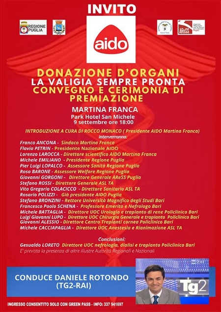 "Donazione d'organi - La valigia sempre pronta": è questo il titolo del convegno, in programma domani (giovedì 9 settembre), alle 18 nella cornice del Park Hotel San Michele di Martina Franca, promosso dalla sezione cittadina dell’Aido, presieduta dal giornalista Rocco Monaco.