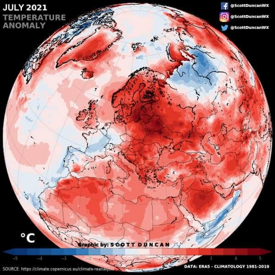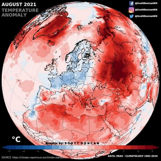 A corredo dell’articolo due immagini, riferite al surriscaldamento del pianeta nei mesi di luglio e agosto, di ScottDuncanWX.