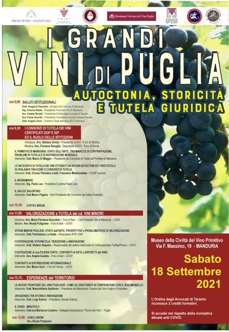 L’Unione dei Giuristi della Vite e del Vino ha organizzato per sabato prossimo (18 settembre), alle ore 9, presso la cantina Produttori di Manduria, nella sala del Museo della Civiltà del Vino Primitivo in Manduria, un seminario in presenza avente ad oggetto “I grandi vini di Puglia. Autoctonia, storicità e tutela giuridica”.