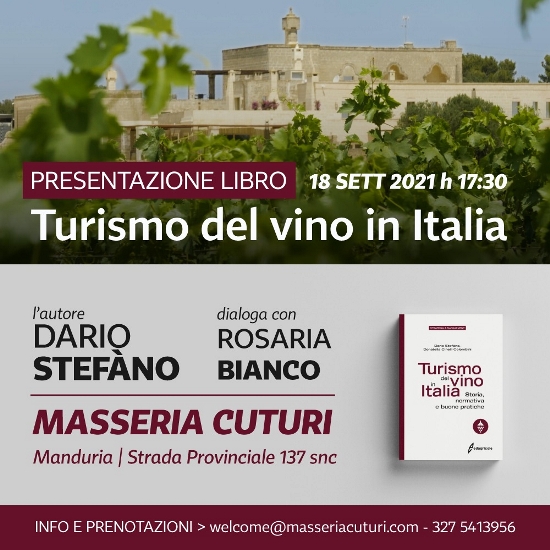 Sabato 18 settembre, alle ore 17,30, presso masseria Cuturi a Manduria, sarà presentato il libro del senatore Dario Stefano e Donatella Cinelli Colombini “Turismo del vino in Italia. Storia, normativa e buone pratiche”.