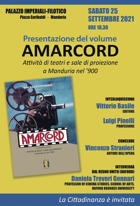 Sarà presentato sabato sera, alle 18,30, all’interno di palazzo Imperiali-Filotico (in piazza Garibaldi), il volume di Vincenzo Stranieri intitolato “Amarcord – Attività di teatri e sale di proiezione a Manduria nel ‘900”.
