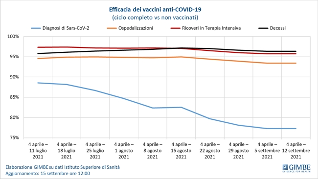 Efficacia vaccini. L’efficacia del vaccino da aprile ad oggi si conferma molto elevata nel ridurre i decessi (95,7%) e le forme severe di malattia che necessitano di ricovero in area medica (93,1%) e in terapia intensiva (95,4%). Relativamente alle diagnosi di SARS-CoV-2, invece, l’efficacia si è ridotta dall’88,5% (periodo 4 aprile-11 luglio) al 76,9% (periodo 4 aprile-12 settembre), in misura inversamente proporzionale all’età: infatti, nella fascia 12-39 anni l’efficacia è scesa sino al 67,2% a inizio agosto, anche se nelle ultime due settimane è risalita al 69,3% .