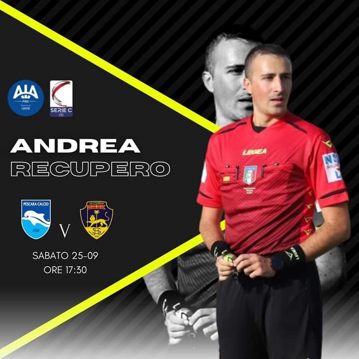 Un fine settimana molto denso per Andrea Recupero, bravo arbitro iscritto alla sezione di Lecce, che, per la prima volta nella sua carriera, respirerà aria di serie C. Anche se non sarà il direttore di gara (Recupero fa parte, per il secondo anno, dei ruoli della CAN della serie D), è stato designato come quarto uomo della partita fra Pescara e Viterbese (arbitro Daniele Virgilio della sezione di Trapani e assistenti Antonio D’Angelo e Andrea Bianchini della sezione di Perugia).
