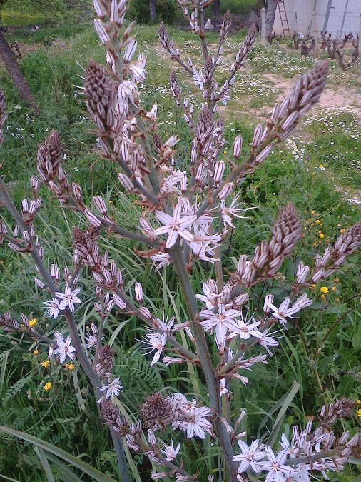 Pianta spontanea perenne tuberosa, è abbondantemente presente nei nostri terreni e lungo le strade di campagna; si nota specialmente nei terreni incolti che hanno subito un incendio, perché i tuberi sono resistenti al fuoco. Il suo nome infatti deriva dal greco ‘a’ (non), ‘spodos’ (cenere) ed ‘elos’ (valle) cioè ‘la valle di ciò che non è diventato cenere’. Proprio questa resistenza al calore del fuoco ha portato molti popoli dell’antichità ad associare l’asfodelo al regno dei morti: nella mitologia greca una distesa di asfodeli in fiore si trovava nella prima zona del Tartaro, accogliendo le anime di coloro che in vita non erano stati né empi né eroi; l’asfodelo compare anche nella tradizione cristiana (conosciuto come ‘bastone di San Giuseppe’) in un racconto dei vangeli apocrifi come segno divino dell’uomo che Maria avrebbe sposato, cioè colui il cui bastone sarebbe fiorito: San Giuseppe portava con sé proprio un bastone di asfodelo (foto in alto, ndr) che, naturalmente, si riempì di fiori.