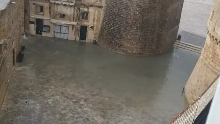 Una violenta bomba d'acqua si è abbattuta nella mattinata di ieri a Otranto e un fulmine è caduto sull'impianto elettrico del Comune, mandandolo fuori uso. In pochi minuti sarebbero caduti più di 100 millimetri di pioggia.