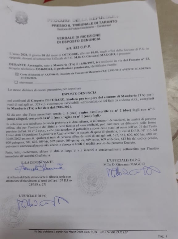 «Io sottoscritto Durante Arcangelo (…), in qualità di ex consigliere comunale di Manduria espongo quanto segue: