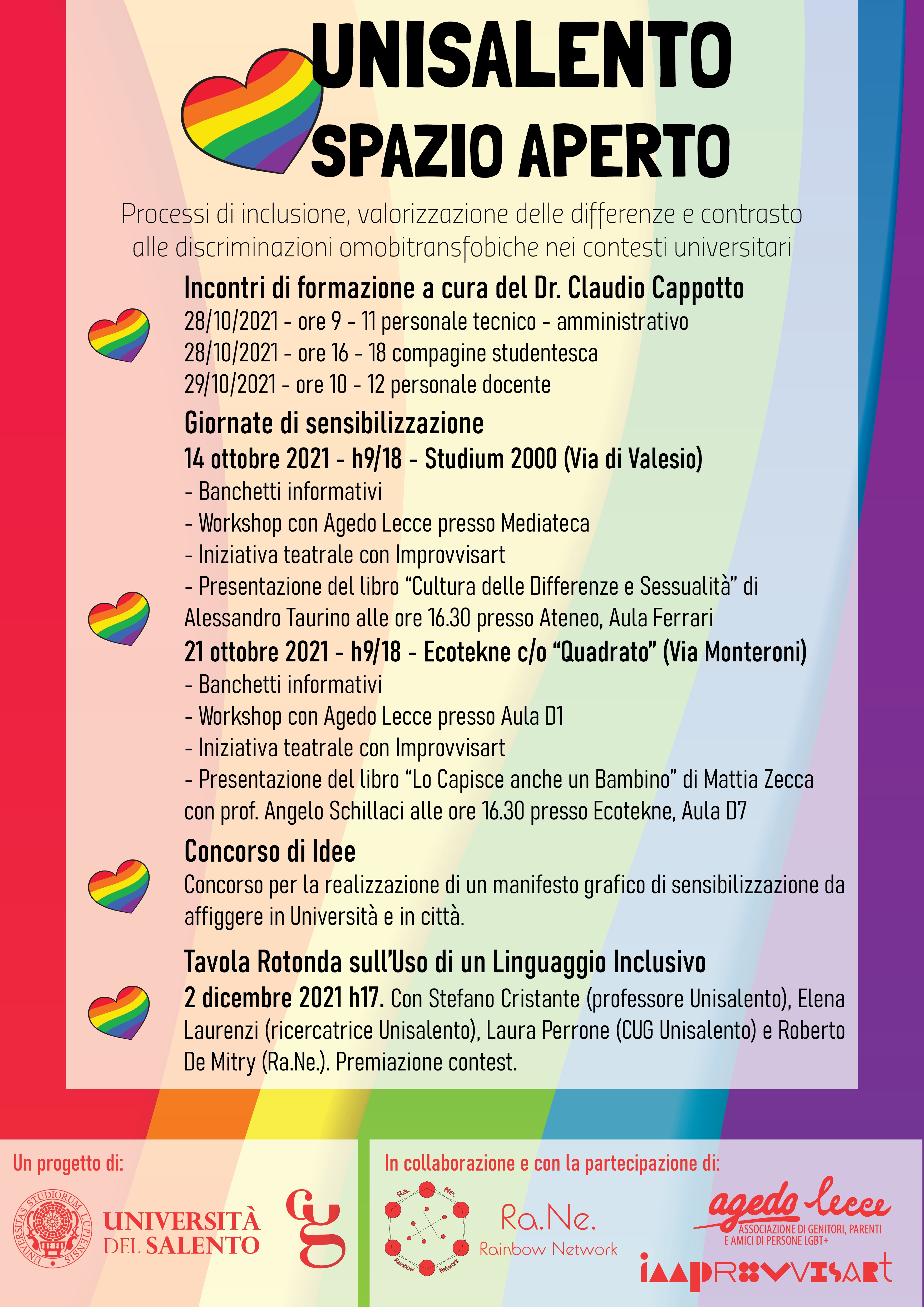 Un ciclo di iniziative per promuovere processi di inclusione e valorizzazione delle differenze e contrastare le discriminazioni omobitransfobiche: si chiama “UniSalento spazio aperto” l’iniziativa a cura del CUG - Comitato Unico di Garanzia dell’Università del Salento, in collaborazione con l’Associazione RaNe - Rainbow Network APS e Agedo Lecce, che a partire dal prossimo 14 ottobre 2021 intende approfondire “le ragioni culturali e psicologiche che, a volte, sono alla base di atteggiamenti di chiusura nei confronti delle sfaccettature sessuali e di genere, offrendo strumenti per riconoscere gli stereotipi e far riflettere su come questi si riverberano nei comportamenti individuali”.