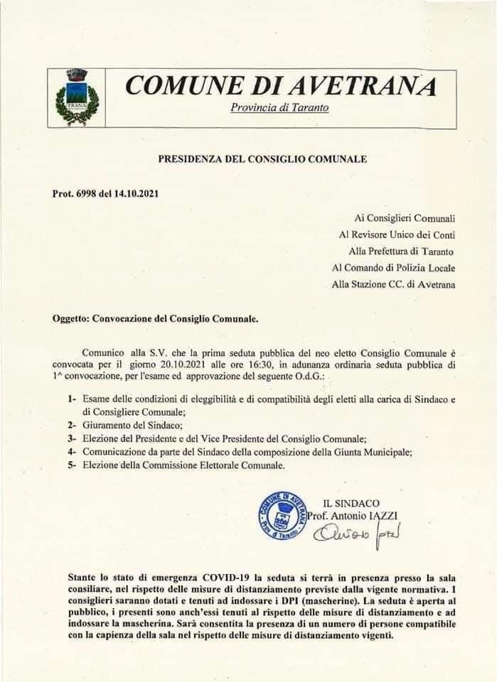 Il nuovo sindaco Antonio Iazzi ha convocato la prima seduta del massimo consesso elettivo per mercoledì 20 ottobre, alle ore 16,30. In questa seduta di insediamento del nuovo il nostro Consiglio comunale, saranno eletti il presidente e il vice presidente del Consiglio comunale e sarà presentata ufficialmente la nuova giunta.