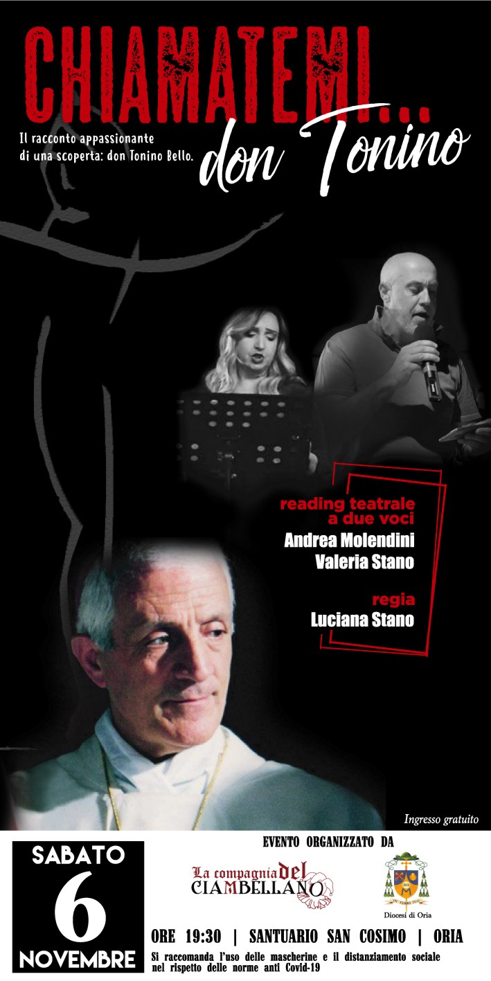 Sabato 6 novembre le porte della nuova basilica di San Cosimo alla Macchia, intitolata a Giovanni Paolo II, apre le porte alla compagnia teatrale “La Compagnia del Ciambellano” di Manduria, per un noto reading teatrale a due voci dal titolo “Chiamatemi Don Tonino. Il racconto appassionante di una scoperta: don Tonino Bello”.