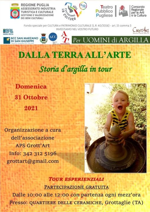 Nella mattina di domenica 31 ottobre, dalle 10 alle 12, l'associazione di promozione turistica Grott'Art organizzerà alcuni piccoli tour esperienziali gratuiti per illustrare il percorso "Dalla Terra all'Arte" dell'argilla con il prezioso contributo dei maestri che nelle loro botteghe, le loro case, aiuteranno soprattutto i più piccoli a provare l'emozione di dare forma alla fantasia di cui sono ricchi.