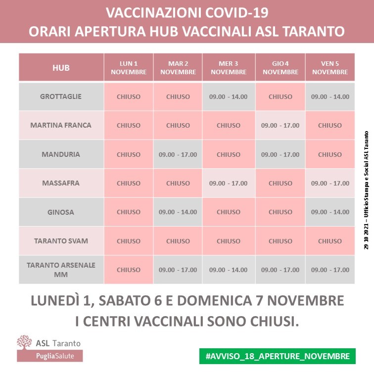 L’hub di Ginosa sarà aperto per le persone prenotate martedì 2 e venerdì 5 novembre dalle 9 alle 14, chiuso mercoledì 3 e giovedì 4 novembre.