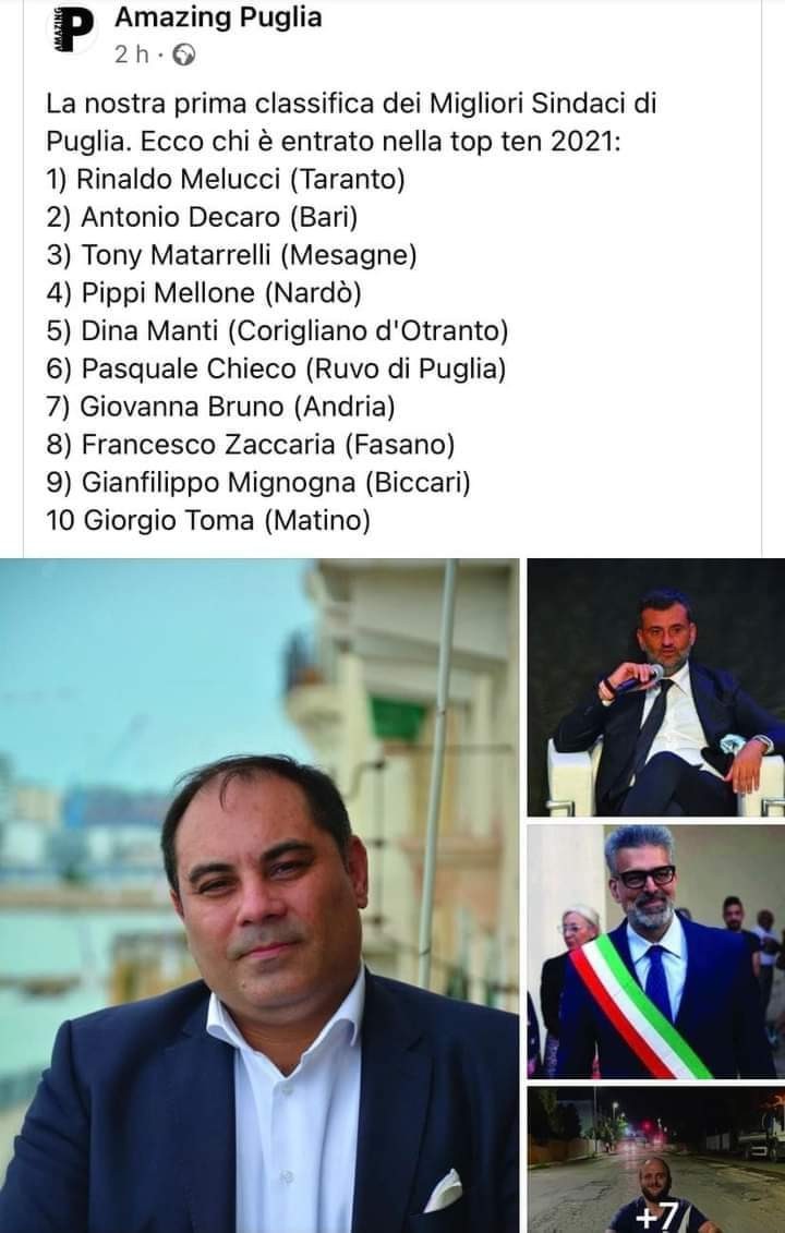 La rivista Amazing Puglia ha elaborato la classifica dei primi 10 migliori sindaci di Puglia, tenendo conto della loro popolarità.