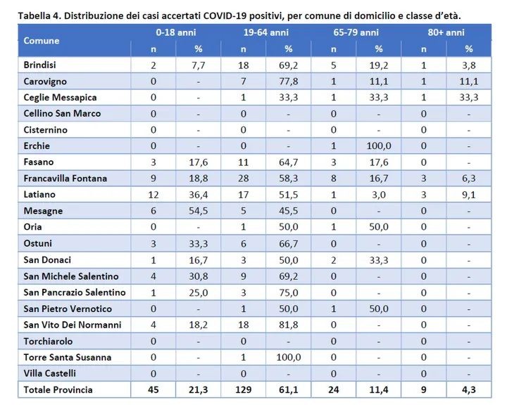 Per quanto riguarda la distribuzione per Comune i positivi sono 48 a Francavilla Fontana, 33 a Latiano, 26 a Brindisi, 22 a San Vito dei Normanni, 17 a Fasano, 13 a San Michele Salentino, 11 a Mesagne, 9 a Carovigno, 9 a Ostuni, 6 a San Donaci, 4 a San Pancrazio Salentino, 3 a Ceglie Messapica, 2 a Oria, 2 a San Pietro Vernotico, 1 a Erchie, 1 a Torre Santa Susanna, 0 a Cellino San Marco, 0 a Cisternino, 0 a Torchiarolo, 0 a Villa Castelli. I Comuni della provincia di Brindisi con i maggiori valori di incidenza cumulativa sono, nell’ordine, Francavilla Fontana, Brindisi, Torre Santa Susanna, Oria.