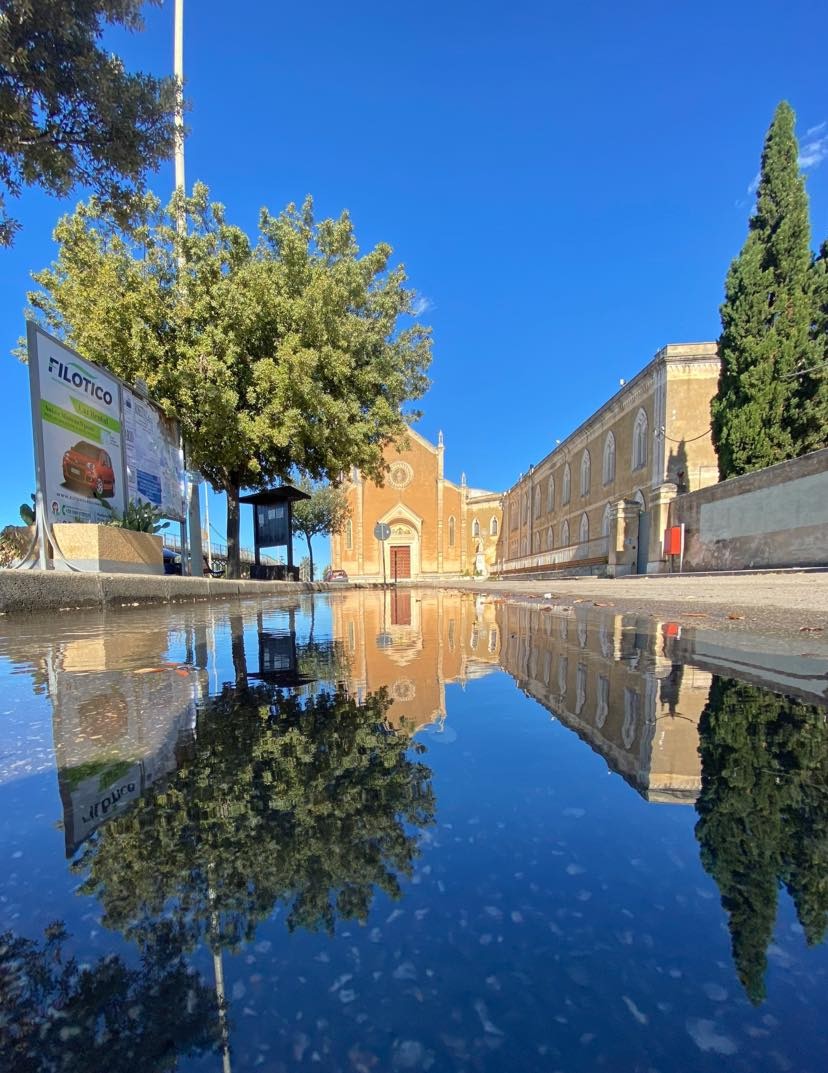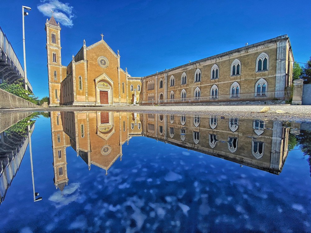 La suggestiva imponenza strutturale della chiesa intitolata a Sant’Antonio e il magnifico cielo blu riflessi in una pozzanghera.