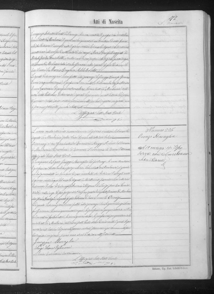L’atto di nascita, rinvenuto nei registri di stato civile del Comune di Manduria del 1869, è il n.225 di quell’anno.