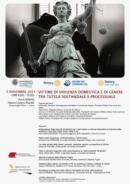“Vittime di violenza domestica e di genere tra tutela sostanziale e processuale” è il tema dell’incontro di studio organizzato dai Dipartimenti di Studi Umanistici e di Scienze Giuridiche dell’Università del Salento in collaborazione con il Rotary Club Lecce sud: l’appuntamento è per venerdì 5 novembre 2021, alle ore 9, nell’aula “Ferrari” di Palazzo Codacci-Pisanelli (piazza Angelo Rizzo, Lecce).
