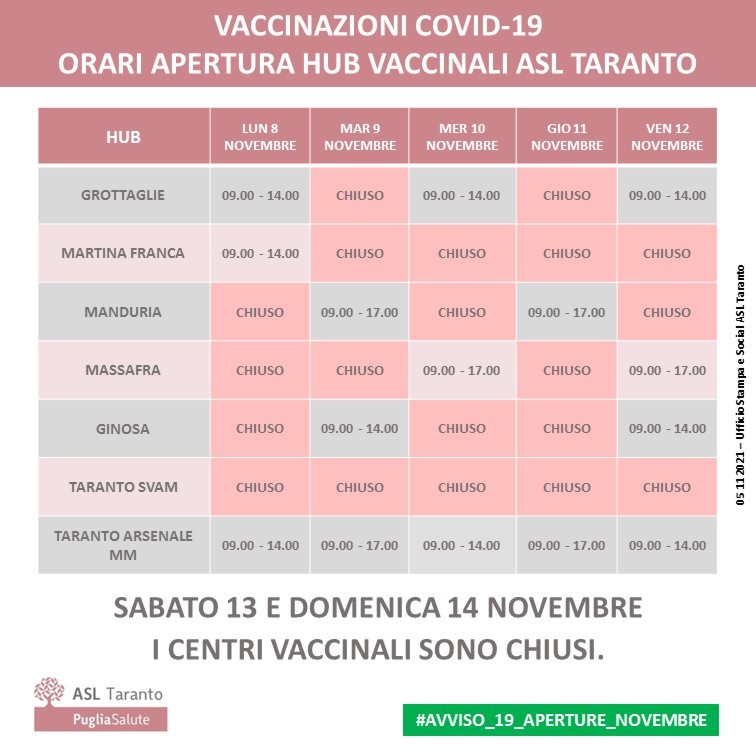 L’hub di Ginosa sarà aperto per le persone prenotate martedì 9 e venerdì 12 novembre dalle 9 alle 14, chiuso lunedì 8, mercoledì 10 e giovedì 11 novembre.