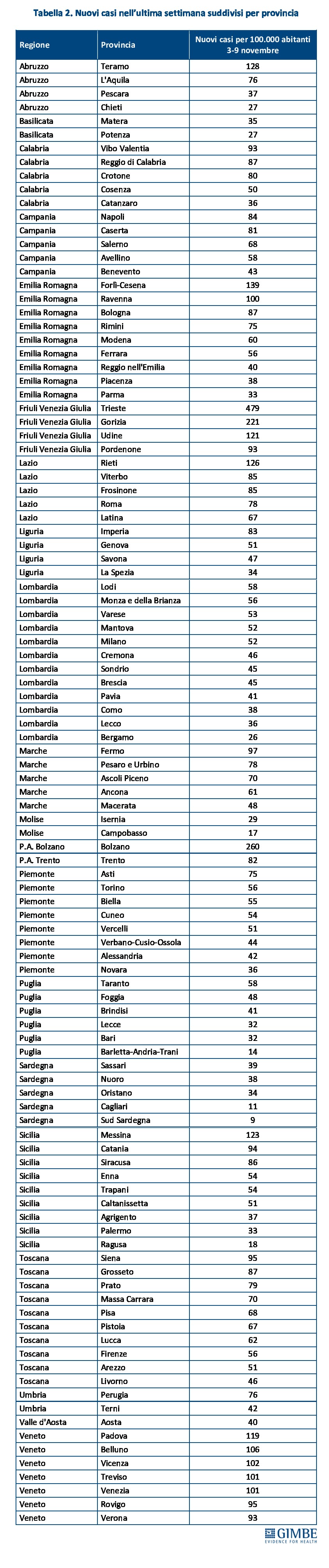Vi proponiamo la tabella riepilogativa dell’incidenza dei casi Covid ogni 100mila abitanti su base settimanale, provincia per provincia, in Italia.