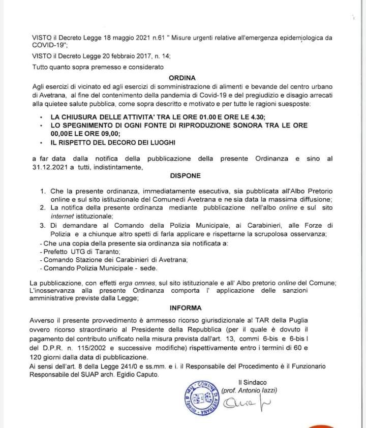 agli esercizi di vicinato e agli esercizi di somministrazione di alimenti e bevande del centro urbano di Avetrana, al fine del contenimento della pandemia di Covid 19 e del pregiudizio e disagio arrecati alle quiete e salute pubblica