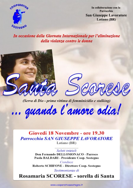 Si terrà giovedì 18 novembre, presso la parrocchia S. Giuseppe Lavoratore in Latiano, in occasione della “Giornata internazionale per l’eliminazione della violenza contro le donne”, con inizio alle ore 18.30, il primo incontro monotematico proposto dalla cooperativa Sostegno di Latiano in collaborazione con la parrocchia “San Giuseppe Lavoratore”.