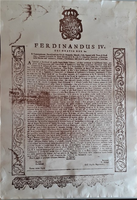 La copia della stampa presente in biblioteca è il decreto reale del 22 settembre 1790. Esso contiene un ‘Memoriale’ nel quale i membri della Sacra Regia Udienza (un'antica istituzione giuridica del Regno di Napoli corrispondente all'attuale Corte d'appello, con competenze giurisdizionali di seconda istanza) informano i ‘colleghi’ della Real Camera di S. Chiara (un organo del Regno di Napoli borbonico con funzioni giurisdizionali di prima istanza)di aver ricevuto dal Procuratore dell’Università di Casalnuovo (che si occupava di seguire determinate questioni nei tribunali provinciali e della Capitale) una supplica (l’attuale ‘ricorso’) per rendere esecutiva la ‘Real Carta’ del 14 novembre, con la quale sua Maestà si è compiaciuto di «accordarle la Grazia di esser lecito alla supplicante [Università] cambiarsi il suo Nome di Casalnuovo in quello antico di Manduria, rimettendone l’esecuzione alla vostra Real Camera di S. Chiara», la quale è pregata di dare esecuzione al ‘Real ordine’ (27 novembre 1789). Successivamente, la stessa Sacra Regia Udienza scrive di un’ulteriore supplica del Procuratore dell’Università di Casalnuovo il quale fa presente che, nonostante abbia ottenuto la Provvisione (corrispondente ad un’attuale deliberazione di un magistrato),«con ordini della Real Camera, in data 27 Novembre del passato 1789, con i quali si è accordata la grazia dalla M.S. di cambiarsi il suo nome di Casalnuovo in quello dell’antica città di Manduria», in realtà questo non sia ancora avvenuto. Pertanto, chiede «darsino gli corrispondenti ordini di essere per tale riconosciuta (…) la supplica compiacersi di scrivere tanto all’Amministrazione Generale delle Dogane, e Sali, che al Regio Precettore di questa Provincia, acciò nei luoghi, e loro rispettivi Registri cambino il nome di Casalnuovo in quello dell’antica città di Manduria, a tenore dei Sovrani Comandi». Pertanto – concludono dalla Sacra Regia Udienza - «abbiamo stimato spedire il presente, col quale dicemo, e commettemo a voi soddetti Algozini (= alti funzionari), che conferendovi personalmente nelle sottoscritte Città, Terre e Luoghi di questa Provincia, debbiate, nelle pubbliche Piazze e Luoghi soliti di esse, ad alta ed intelligibile voce come è di costume, emanare e pubblicare il Banno suddetto, e quanto in esso si contiene, affinché de ognuno si sappia, di essersi la prefata M. S. degnata accordare all’Università e Cittadini di Casalnuovo, di cambiarsi il suo nome di Casalnuovo in quello dell’antica Città di Manduria, essendo tale la sua Real volontà».