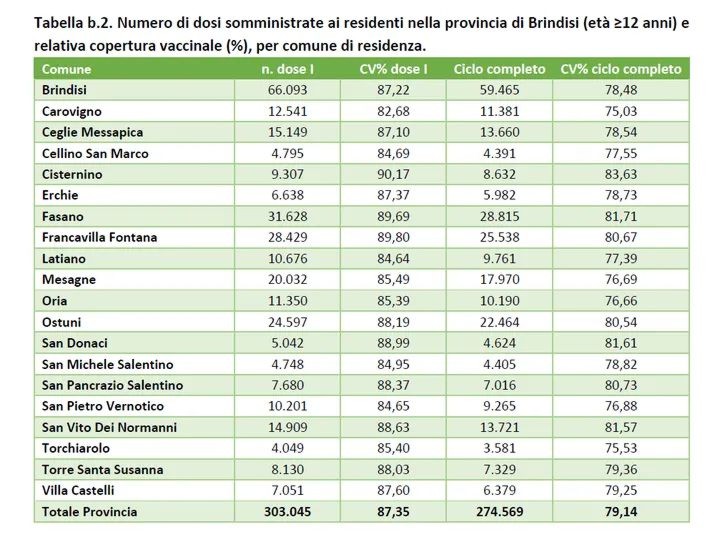 Fino all'11 novembre i residenti o domiciliati in provincia di Brindisi vaccinati con la prima dose sono 303.045 e di questi 274.569 con la seconda dose, con una copertura vaccinale pari rispettivamente all'87,4% e al 79,1%. La copertura vaccinale con la prima dose relativa ai residenti con più di 80 anni di età è pari al 96,7% e al 93,4% per il ciclo completo.