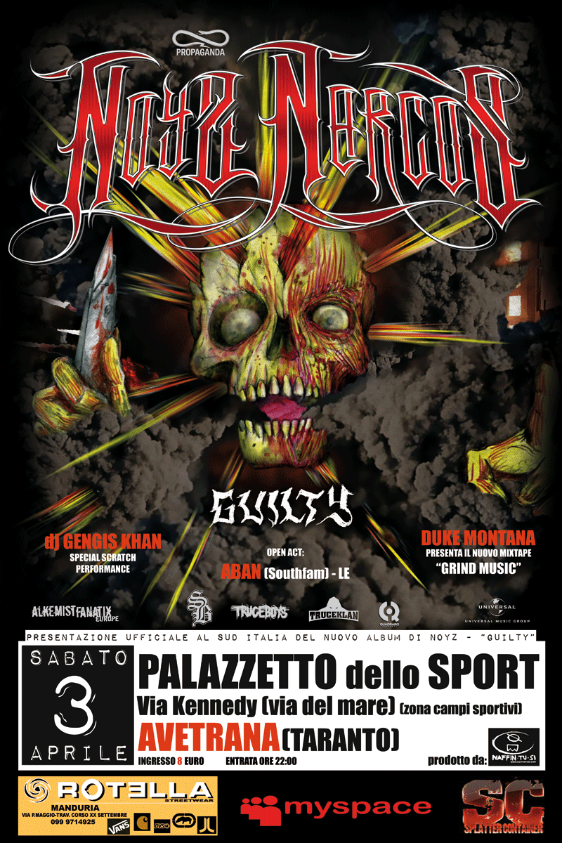 Ad organizzare la serata è NAFFINTUSI, casa di produzione cinematografica e audiovisiva, che ha curato anche il video di un altro componente del TRUCEKLAN (la crew di cui fa parte NOYZ NARCOS), ovvero DUKE MONTANA che per l’occasione presenterà il suo nuovo mixtape “GRIND MUZIK”.