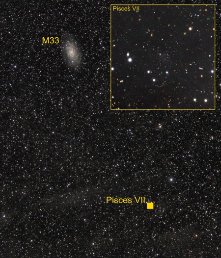 La nuova galassia, denominata Pisces VII, è stata scoperta dall’astrofilo pugliese Giuseppe Donatiello, responsabile della Sezione Nazionale di Ricerca Profondo Cielo dell’Unione Astrofili Italiani. Pisces VII è la sua quinta galassia nana scoperta, dopo Donatiello I (2016) e tre nuovi satelliti della galassia NGC 253, denominati Donatiello II, III e IV, trovati l’anno scorso.