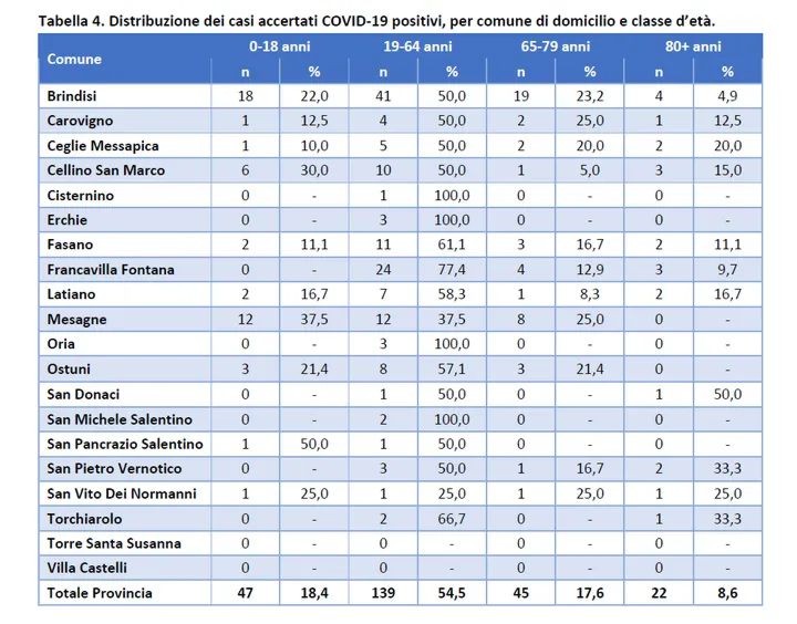 Per quanto riguarda la distribuzione per Comune i positivi sono 82 a Brindisi, 32 a Mesagne, 31 a Francavilla Fontana, 20 a Cellino San Marco, 18 a Fasano, 14 a Ostuni, 12 a Latiano, 10 a Ceglie Messapica, 8 a Carovigno, 6 a San Pietro Vernotico, 4 a San Vito dei Normanni, 3 a Erchie, 3 a Oria, 3 a Torchiarolo, 2 a San Donaci, 2 a San Michele Salentino, 2 a San Pancrazio Salentino, 1 a Cisternino, 0 a Torre Santa Susanna, 0 a Villa Castelli.