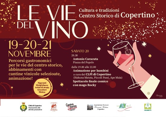 Copertino si accende di gusto, in queste ore, per il weekend alle porte. Da oggi a domenica il centro storico della città che ha dato i natali a San Giuseppe da Copertino si animerà infatti di sapori e profumi irresistibili, a partire dalle 20.30, grazie a “Le vie del vino”, prima edizione di una rassegna enogastronomica ideata dall’associazione Commercianti del Centro Storico in collaborazione con il Gal Terra d’Arneo, la Pro Loco “Fernando Verdesca”, l’associazione Borghi Autentici d’Italia, Coldiretti, e con il patrocinio del Comune e il sostegno dell’assessorato comunale alle Attività Produttive.