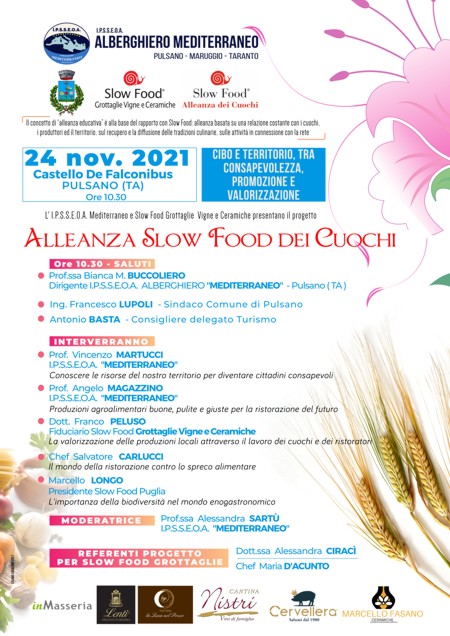 Alla presenza del sindaco di Pulsano Francesco Lupoli, e del consigliere delegato al Turismo Antonio Basta, la dirigente Bianca Maria Buccoliero presenterà il progetto che vede coinvolti studenti, docenti, aziende del territorio regionale e Cuochi dell’Alleanza sia in Italia che all’estero.