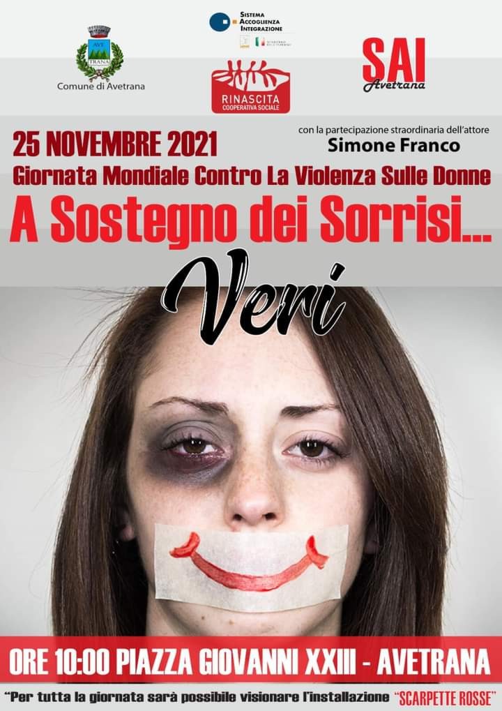 In occasione della Giornata Internazionale contro la Violenza sulle Donne che ricorre ogni anno il 25 novembre, l’Amministrazione comunale dì Avetrana, con la preziosa collaborazione della cooperativa sociale Rinascita ed il centro SAI (Sistema Accoglienza e Integrazione) di Avetrana, organizza una giornata volta a sensibilizzare i cittadini, di supporto a tale battaglia di civiltà, denominata “A Sostegno dei Sorrisi…Veri” presso piazza Giovanni XXIII, nei pressi della Panchina Rossa.