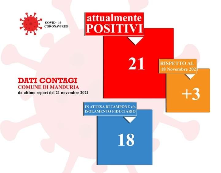 Lieve crescita del numero dei manduriani attualmente positivi al Covid: si è passati dai 18 del 17 novembre ai 21 del 21 novembre. In crescita anche i manduriani in isolamento fiduciario: in 4 giorni sono passati da 12 a 18.