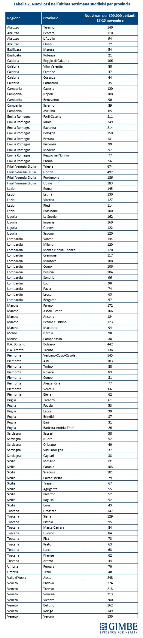 In 92 province si registra un’incidenza pari o superiore a 50 casi per 100.000 abitanti: in Abruzzo, Campania, Emilia-Romagna, Friuli-Venezia Giulia, Lazio, Liguria, Lombardia, Marche, Piemonte e Veneto tutte le province superano tale soglia. In 18 province si contano oltre 150 casi per 100.000 abitanti: Trieste (674), Gorizia (492), Bolzano (442), Forlì-Cesena (311), Padova (274), Rimini (249), Aosta (248), Ravenna (214), Treviso (213), Venezia (213), Vicenza (200), Pordenone (186), Udine (183), Fermo (172), Ascoli Piceno (166), Belluno (162), La Spezia (162) e Imperia (160).