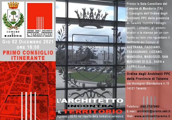 Il nuovo Consiglio dell’Ordine degli Architetti PPC della provincia di Taranto si è insediato poco prima di agosto 2021 e, come da buona prassi oramai consolidata negli anni, ricomincia con i “Consigli Itineranti”: la prima tappa sarà a Manduria, nell’aula consiliare e vedrà un confronto aperto su varie tematiche territoriali che investono l’intera area orientale della provincia. Interesserà infatti anche i Comuni di Avetrana, Faggiano, Fragagnano, Lizzano, Maruggio, San Marzano, Sava, Torricella