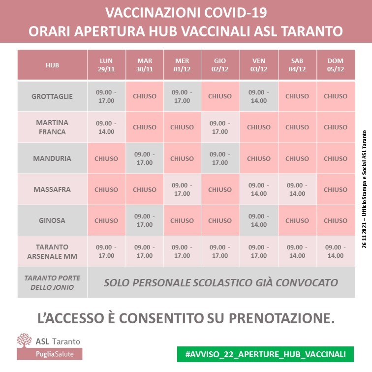 L’hub di Ginosa sarà aperto per le persone prenotate martedì 30 novembre dalle 9 alle 17 e venerdì 3 dicembre dalle 9 alle 14, chiuso lunedì 29 novembre, mercoledì 1, giovedì 2, sabato 4 e domenica 5 dicembre.