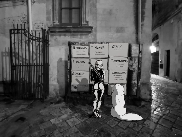 Il profondo degrado dei valori etici della nostra società in una incisiva e graffiante illustrazione di Carmela Gentile. Un tabellone riservato all’affissione di manifesti funebri in un angolo suggestivo del centro storico di Manduria. Su quei manifestini, però, non ci sono i nomi dei defunti, bensì vari annunci di valori ormai prossimi a scomparire: dalla speranza alla carità, dall’ironia al buon gusto, dalla dignità alla gentilezza. Di spalle, a leggere quelle … dipartite, una donna e il suo cane, rappresentati con due colori contrastanti: il bianco e il nero.