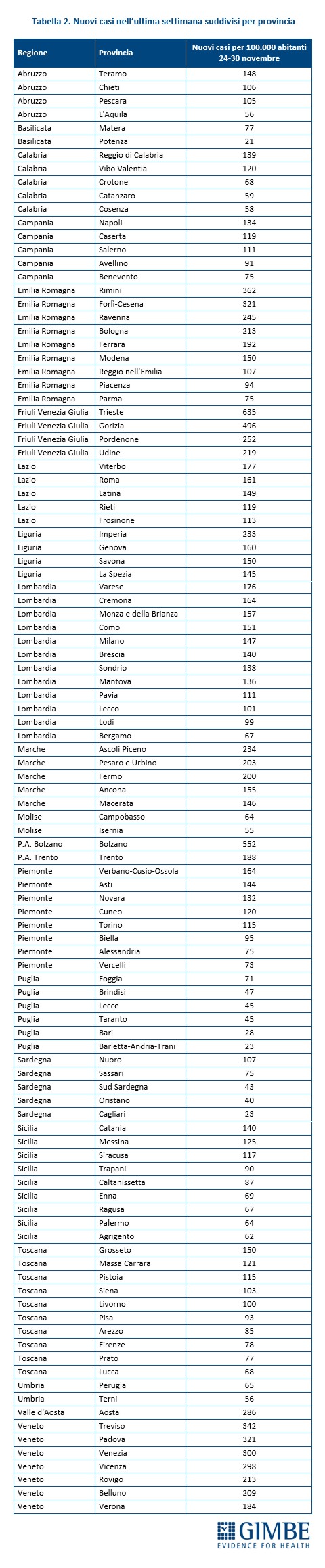 Il monitoraggio della fondazione Gimbe accerta che in 98 province l’incidenza è pari o superiore a 50 casi per 100.000 abitanti e in 16 regioni tutte le province superano tale soglia: Abruzzo, Calabria, Campania, Emilia-Romagna, Friuli-Venezia Giulia, Lazio, Liguria, Lombardia, Marche, Molise, Piemonte, Sicilia, Toscana, Umbria e Veneto.