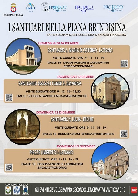 I Santuari nella Piana Brindisina, tra devozione, arte, cultura e enogastronomia è un progetto, finanziato dalla Regione Puglia, promosso dalle Pro Loco di Latiano, Torre Santa Susanna ed Erchie con il patrocinio dell’UNPLI Puglia, della città di Latiano, Torre S. Susanna e Erchie.